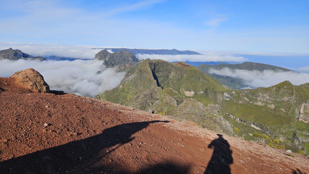 Blij verrast schijnt de zon toch écht boven de wolken! Op de weg hiernaartoe was het wisselend bewolkt en mistig (voor zover te zien was vanuit de auto starend naar een nog ontwakende, donkere wereld). Vanuit de auto, onze slaaproes achter ons latend, hadden we er een hard hoofd in. Al enkele dagen hadden we de voorspellingen op Pico Ruivo op de voet gevolgd en vandaag uitgekozen als de dag/ochtend met de meeste kans op zicht. Dagen hiervoor waren de voorspellingen slecht op de berg (regen, dichte bewolking), maar écht weten deden we het natuurlijk niet.